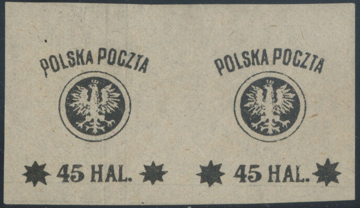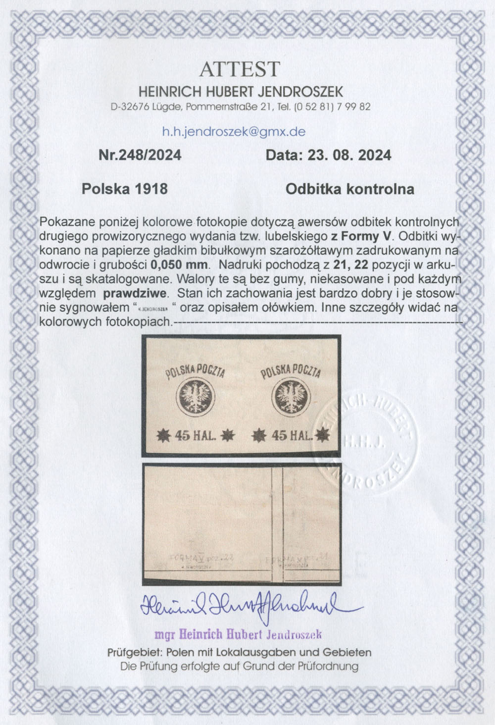 1918 drugie wydanie lubelskie, parka odbitek kontrolnych całego arkusza formy V z poz. 21-22, odbitki takie wykonano dla każdej z form na odwrocie rosyjskich formularzy, bardzo rzadkie, fotoatest Jendroszek.