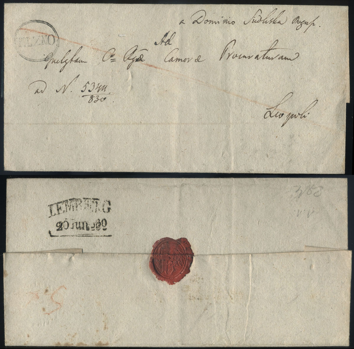 1830 obwoluta listu z Pilzna do Lwowa, ładnie zachowana pieczęć lakowa i stempel odbiorczy na odwrocie.