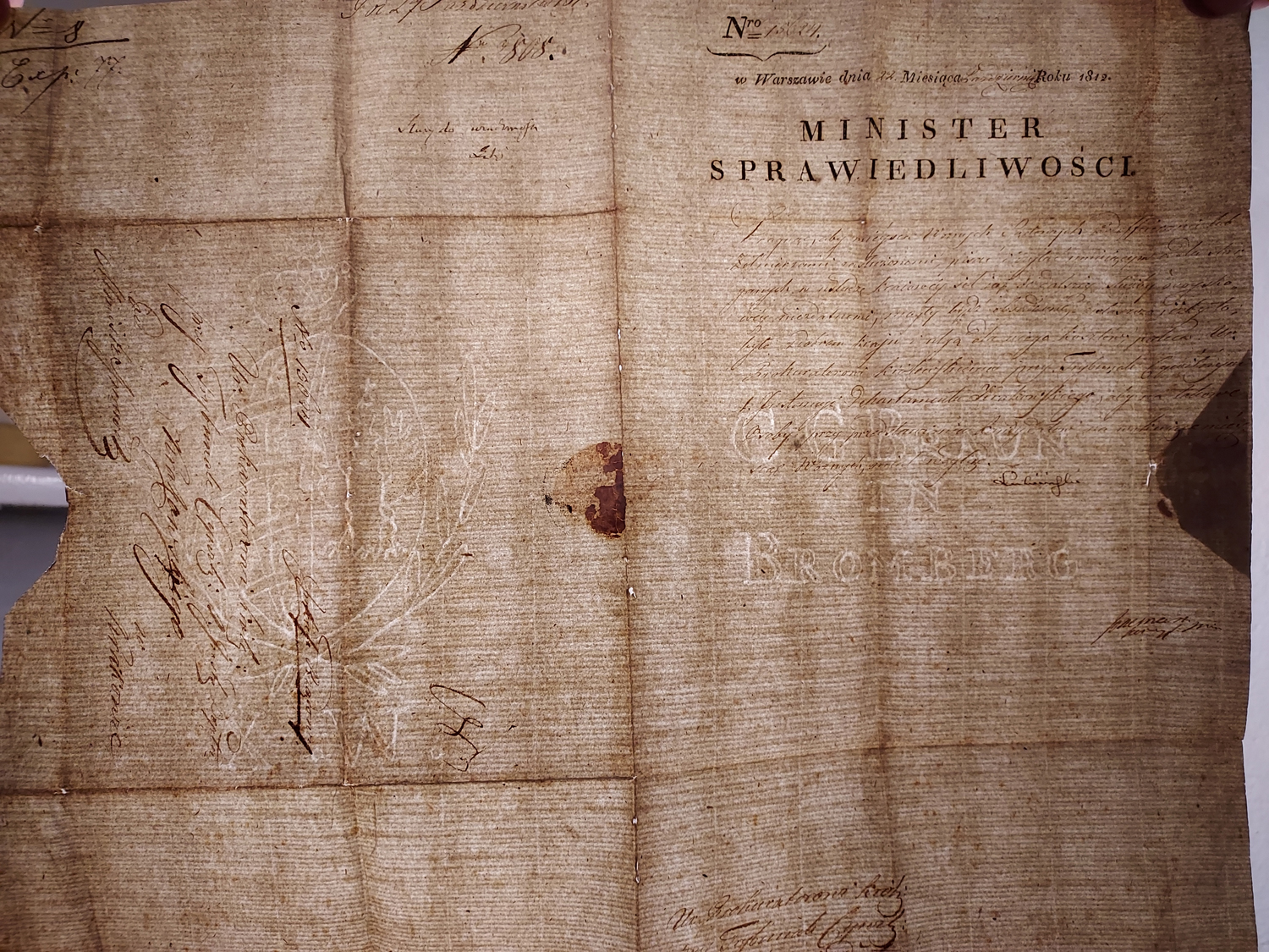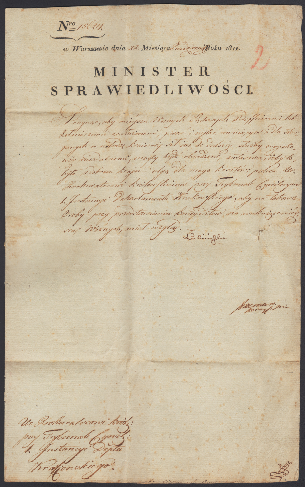 1812 Księstwo Warszawskie, MINISTER SPRAWIEDLIWOŚCI, kompletny list z pełną treścią z Warszawy do Krakowa datowany "22 Października", papier z wydrukowanym nagłówkiem "MINISTER SPRAWIEDLIWOŚCI", dokument z własnoręcznym podpisem ministra sprawiedliwości Feliksa Łubieńskiego; znak wodny - na lewym półarkuszu: herb Księstwa Warszawskiego z literami "X.W." pod spodem, na prawym półarkuszu "CB BRAUN IN BROMBERG"; z okresu Księstwa Warszawskiego nie znane są stemple o charakterze nadawczym, a jedynie pieczęcie lakowe do zabezpieczania przesyłek i stemple opłaty w urzędach pogranicznych; na froncie dopisek zwalniający korespondencję urzędową od opłaty pocztowej "Interes Rządowy"; na odwrocie częściowo widoczna pieczęć nadawcy z godłem "... SPRAWIEDLIWOŚCI"; rzadki walor w dobrym stanie zachowania.