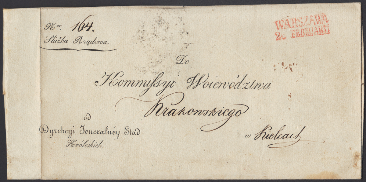 1821 około, WARSZAWA - list z Dyrekcyi Jeneralnej Stad Króleskich w Warszawie do Kommissyi Woiewództwa Krakowskiego w Kielcach, czerwony dwuwierszowy (28x4,5 mm) stempel nadawczy WARSZAWA 26 FEBRUARII, papier do korespondencji z częściowo wydrukowanymi napisami dotyczącymi zarówno nadawcy jak i adresata, w tym "Służba Rządowa" co zwalniało korespondencję urzędową od opłaty pocztowej; znak wodny "orzeł zrywający się do lotu w ornamencie kolistym"; na odwrocie adnotacje pocztowe i częściowo zachowana pieczęć nadawcy z godłem "... POLSKIE ... STAD I STACYJ STADNYCH"; dobry stan zachowania.