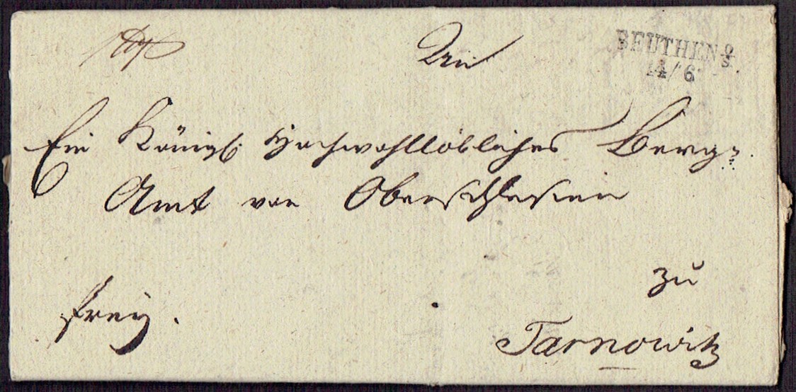 1827 Beuthen (Bytom), kompletny składany list wysłany z Beuthen (Bytom) do Tarnowitz (Tarnowskie Góry).