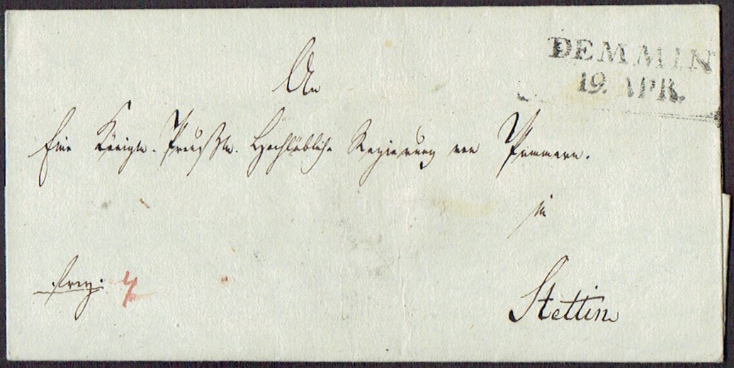 1817 po, Demmin (Dyminek k.Człuchowa), obwoluta listu wysłanego z Demmin (Dyminek) do Stettin (Szczecin).