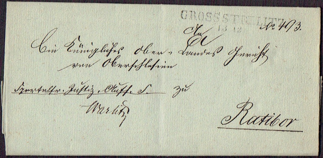 1825 po, Gross Strelitz (Strzelce Opolskie), obwoluta listu wysłanego z Gross Strelitz (Strzelce Opolskie) do Ratibor (Racibórz).