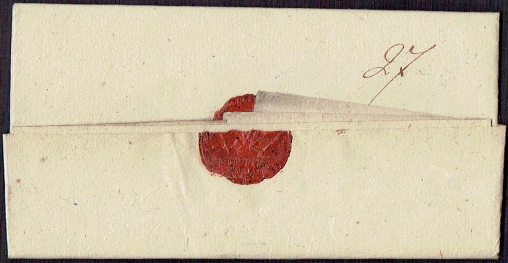 1804 obszar I Rzeczypospolitej - RYGA jednowierszowy w ramce stempel rosyjski z napisem łacińskim RIGA (Dobin 40.1.02), czytelnie odciśnięty na kompletnym liście do Goldyngi (Goldingen); w 1561 roku Inflanty zostały lennem Rzeczypospolitej, Ryga była wówczas największym portem Inflant i jednym z największych na Bałtyku; w 1580 po pokonaniu Iwana Groźnego król Stefan Batory triumfalnie wjechał do Rygi; w 1605 w bitwie pod Kircholmem pod Rygą 4-tysięczne wojska polsko-litewskie pod dowództwem hetmana Chodkiewicza rozgromiły 11-tysięczną armię szwedzką, a król szwedzki musiał salwować się ucieczką; 25.IX.1621 roku Szwedzi zdobyli Rygę i nie powróciła ona już do Rzeczypospolitej; Goldynga była stolicą Kurlandii i siedzibą książąt kurlandzkich, miasto wraz z całą Kurlandią zostały w III rozbiorze zagarnięte przez Rosję; stemple nadawcze z przełomu XVIII i XIX wieku wprowadzone na obszarze zaboru rosyjskiego po rozbiorach i stosowane w okresie do końca wojen napoleońskich są bardzo rzadkie; zgrabny walor w dobrym stanie zachowania.