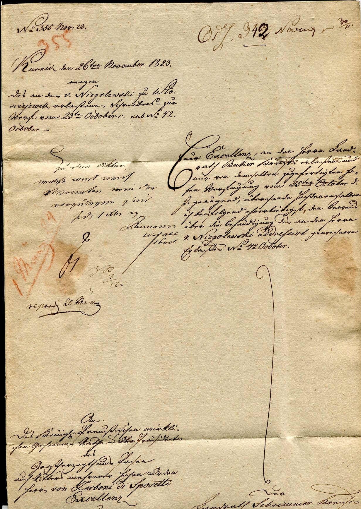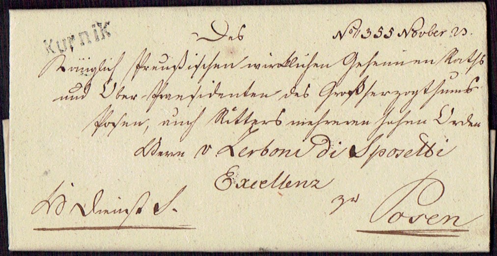 1823 Kurnik (Kórnik), kompletny składany list wysłany z Kurnik (Kórnik) do Posen (Poznań), wewnątrz pismo napisane w Kurniku w dniu 26.11.1823, ponadto pieczęć lakowa w dobrym stanie.