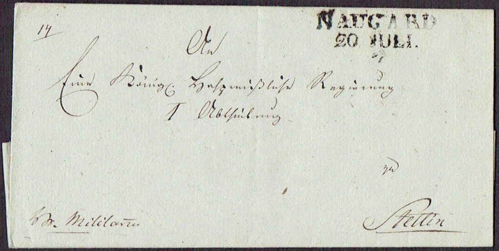 1817 po, Naugard (Nowogard), obwoluta listu wojskowego wysłanego z Naugard (Nowogard) do Stettin (Szczecin).
