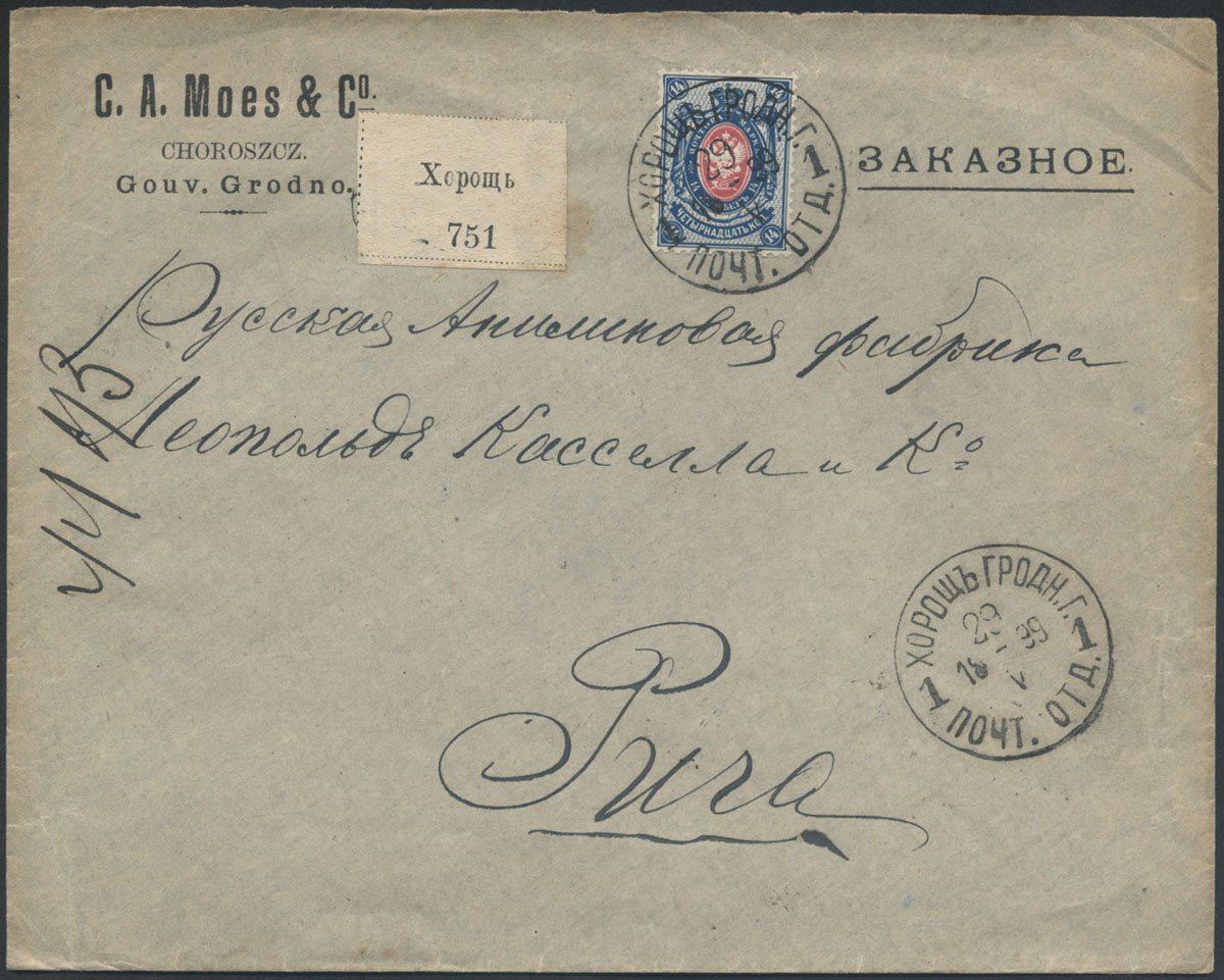 1899 list polecony z Choroszczy do Rygi, na odwrocie stemple odbiorcze. | |
