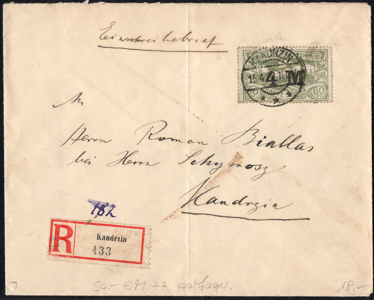1922 Górny Śląsk, miejscowy list polecony z Kandrzin (Kędzierzyn). | Fi.23 |