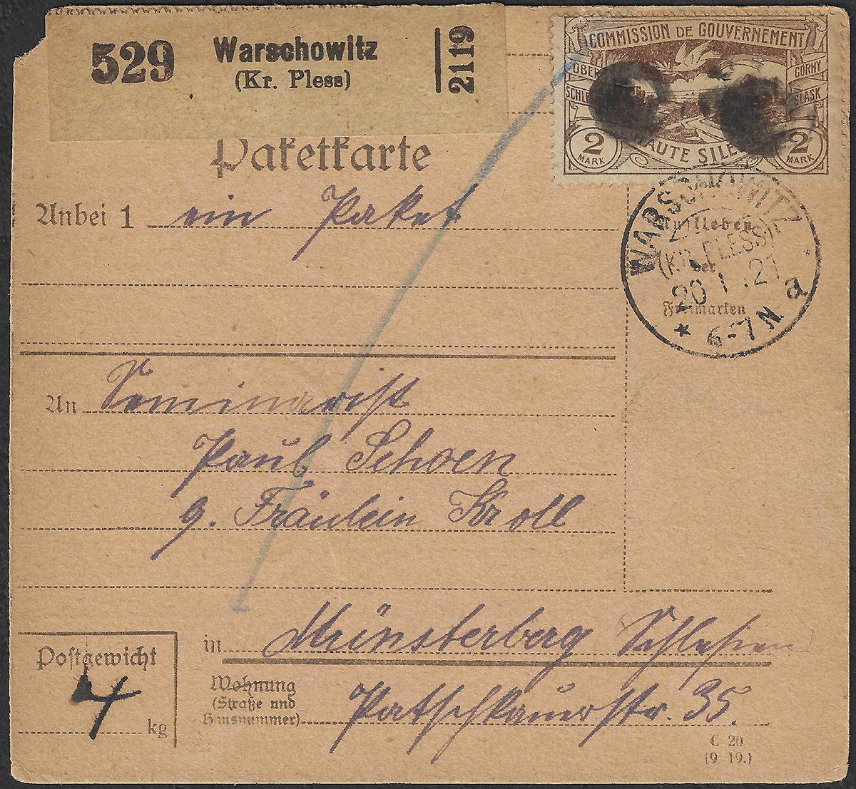 1921 Górny Śląsk, przekaz paczkowy z Warschowitz (Warszowice) do Niemiec, obok datownika stempel korkowy, na odwrocie stempel odbiorczy. | Fi.27 |