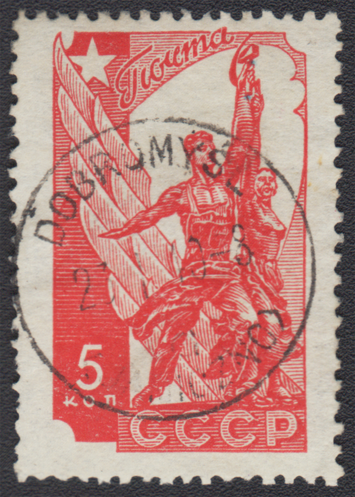 1940 Obszary anektowane przez ZSRR, tereny włączone do Białorusi - DOBROMYŚL (JAMICZNO) - znaczek radziecki za 5 kop skasowany 23 I czytelnie odciśniętym polskim datownikiem agencji pocztowej DOBROMYŚL (JAMICZNO) z wyróżnikiem "a"; bardzo dobry stan zachowania.