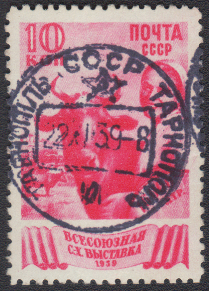 1939 Obszary anektowane przez ZSRR, tereny włączone do Ukrainy - TARNOPOL - znaczek radziecki za 10 kop skasowany 3.XII wyraźnie odciśniętym radzieckim datownikiem "ТАРНОПIЛЬ CCCP ТАРНОПОЛЬ" z nieczytelnym wyróżnikiem; bardzo dobry stan zachowania.