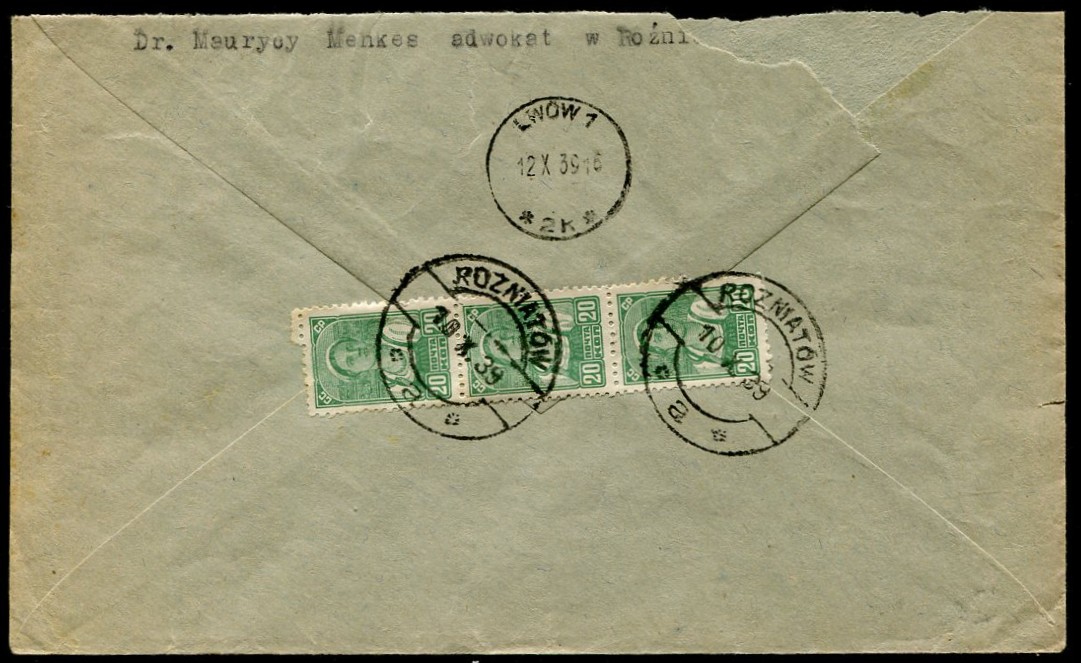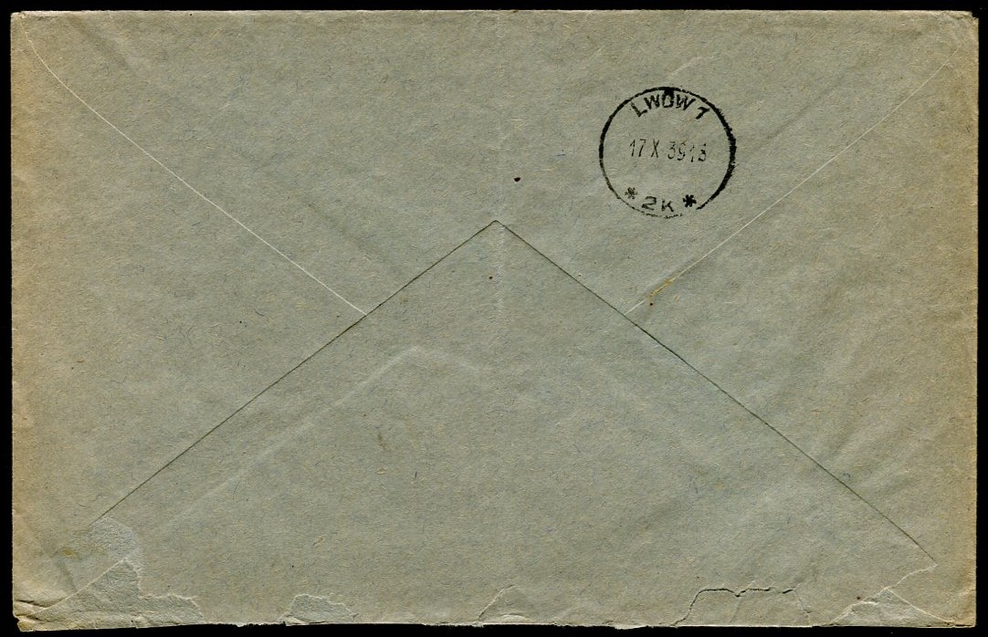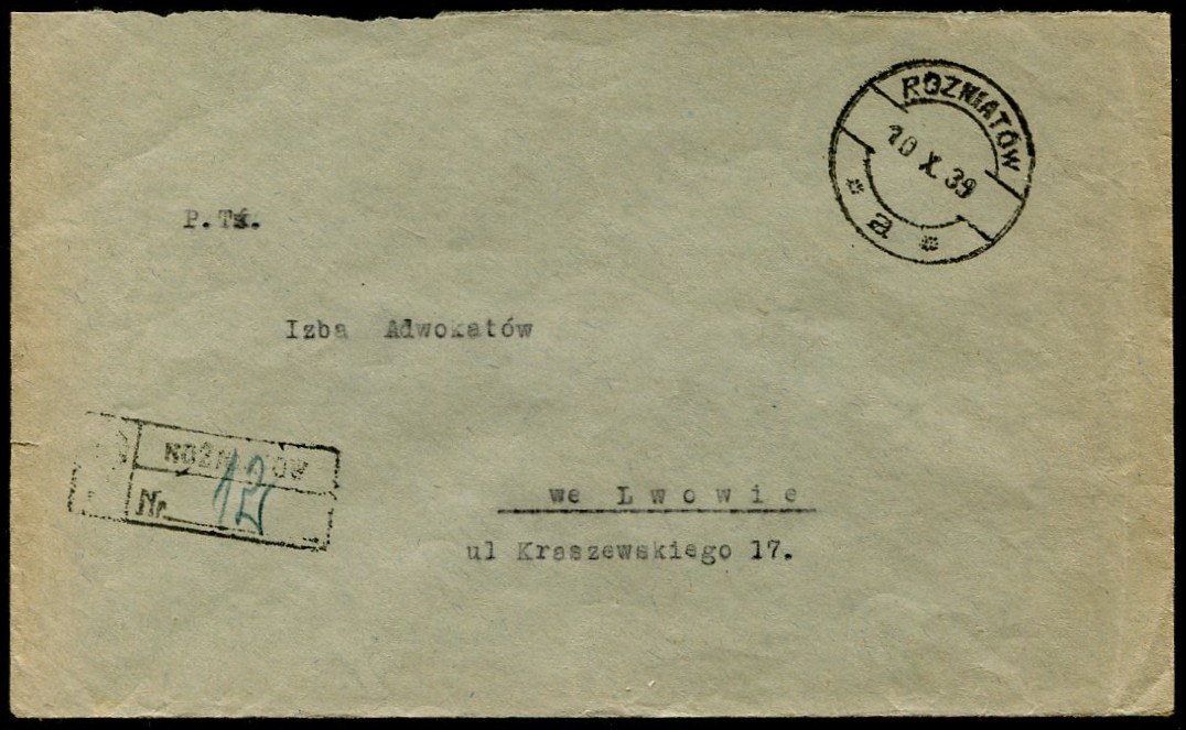 1939 list polecony został wysłany 16.10.1939 z Obertyna do Lwowa (będących pod okupacją rosyjską), stempel polecenia i datownik z Obertyna i datownik odbiorczy ze Lwowa polskie, znaczki rosyjskie.