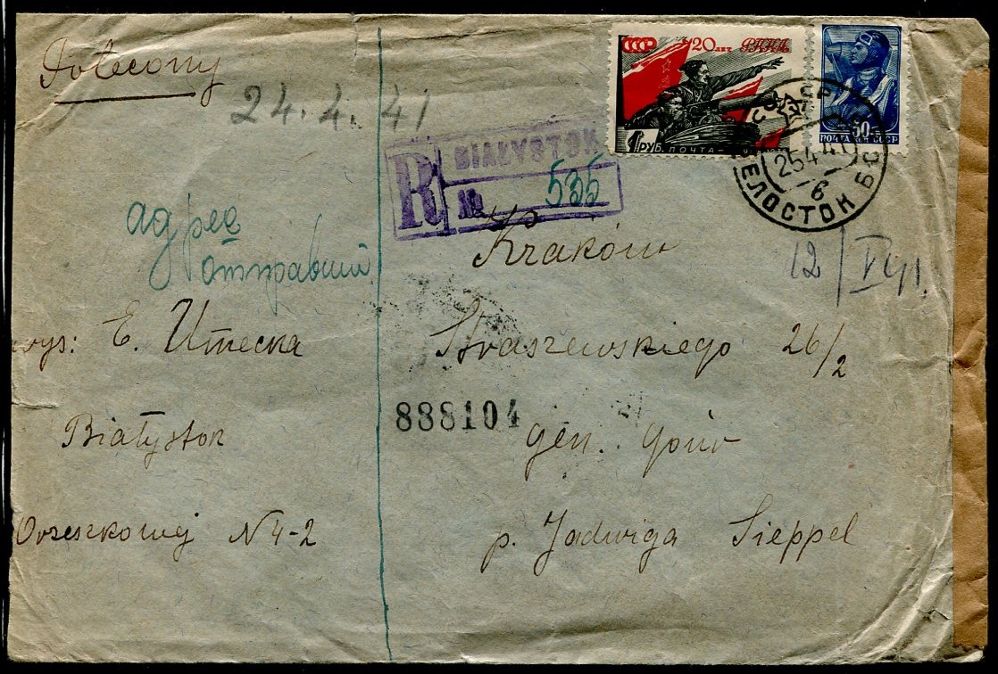 1941 list polecony został wysłany 25.04.1941 z Białegostoku (będącego pod okupacją rosyjską) do Krakowa (będącego pod okupacją niemiecką), polski stempel polecenia z Białegostoku był stosowany od ponad roku, dodatkowo odbity niemiecki stempel cenzury, kartka dotarła do adresata po dwóch tygodniach. | |