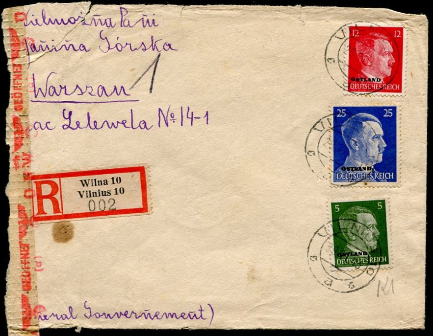 1943 VILNIUS (Litwa), koperta listu poleconego wysłanego z Wilna, znaczki posiadają nadruk "OSTLAND". | Fi.OkN8,14 |