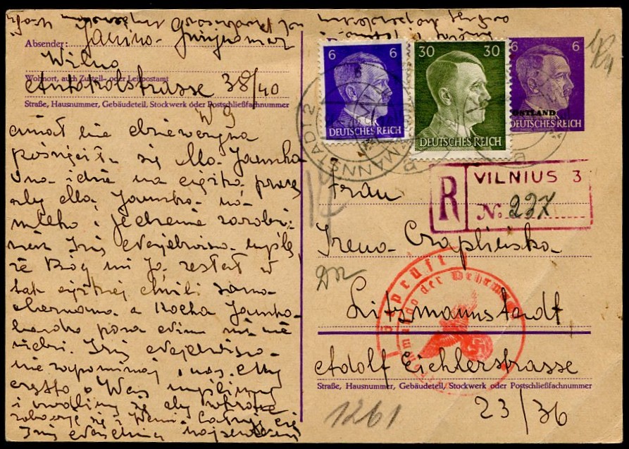 1942 Vilnius (Litwa), karta polecona wysłana z Wilna, mimo że był to rok 1942 dwa znaczki nie posiadają nadruku "OSTLAND". | Fi.OkNCp2, OnN22,31 |