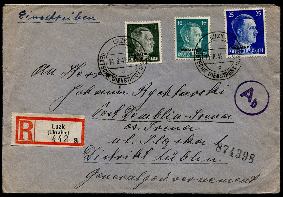 1942 Luzk (Ukraina), koperta listu poleconego wysłanego z Łucka, trzy znaczki z nadrukiem "UKRAINE". | Fi.OkN21,30,33 |