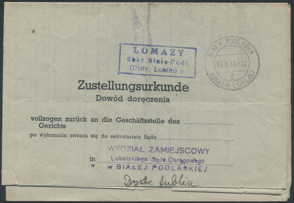 1944 sądowy dowód doręczenia ze stemplem pośrednictwa pocztowego w Łomazach (urząd zwierzchni w Białej Podlaskiej). | |