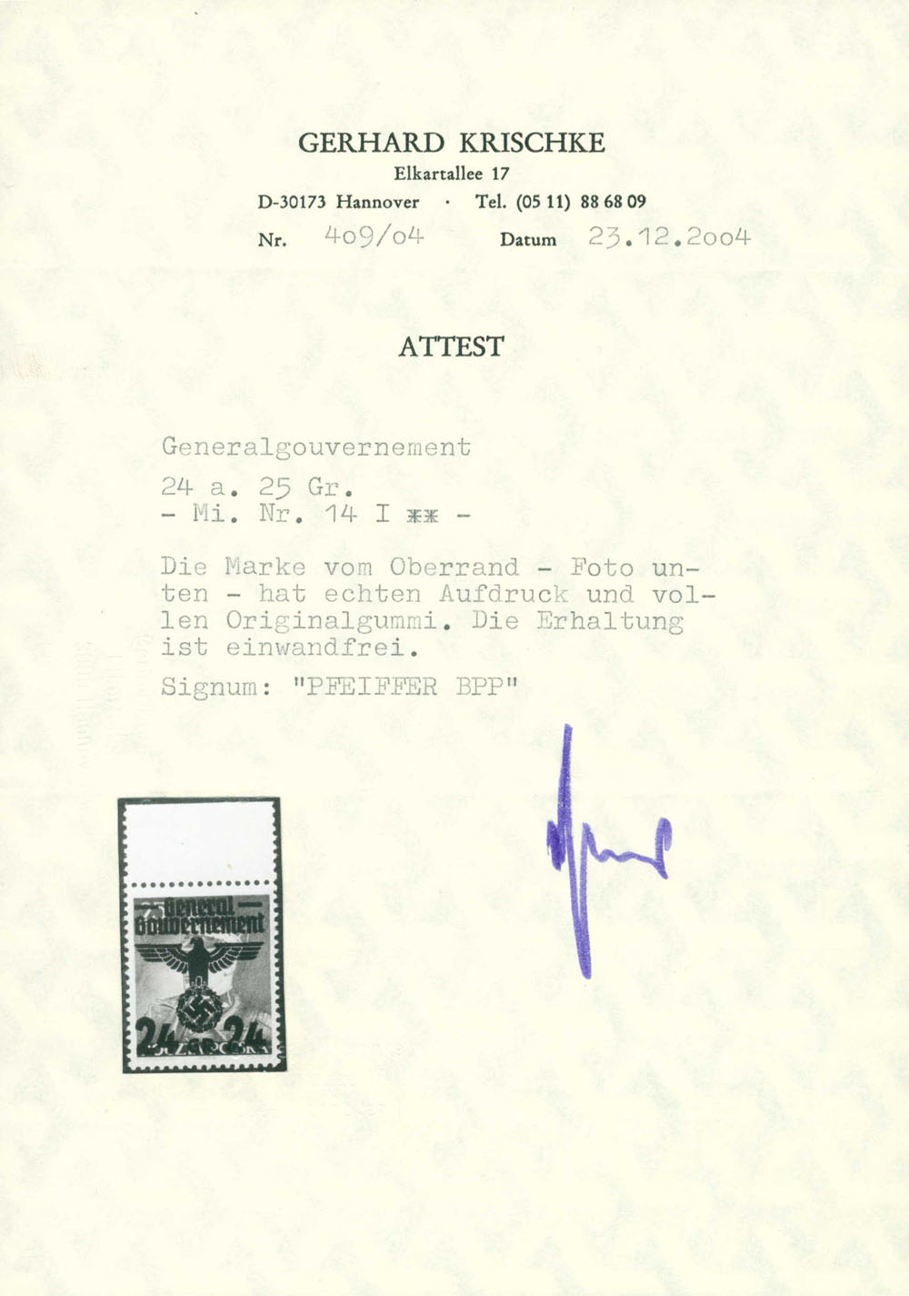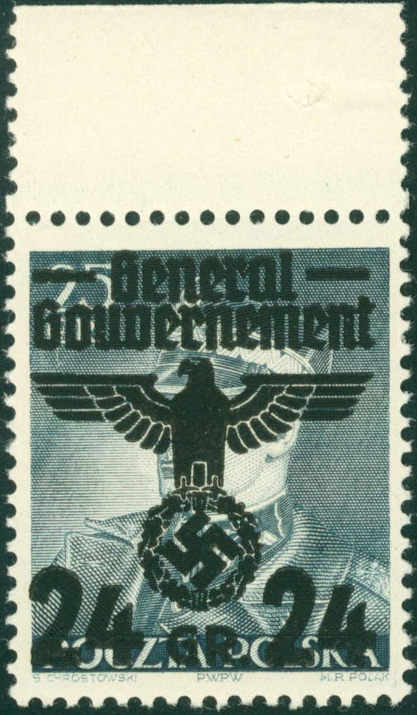 1940 wydanie przedrukowe, nadruk na znaczku polskim za 25 gr. z tłem kreskowanym, zdwojony nadruk, podwójny stempelek gwarancyjny Pfeifer, pojedynczy stempelek gwarancyjny i opis Walisch, fotoatest Krischke. | Fi.14 I Mi.14 I |