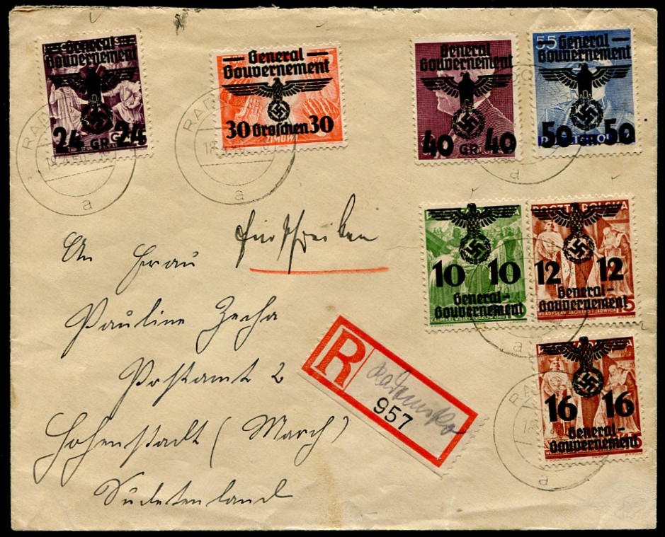 1940 Radomsko, koperta listu poleconego wysłanego z Radomska, na kopercie znaczki przedrukowe, znaczek Fi.33II | Fi.15,16,21,22,30,33II,34 |