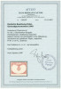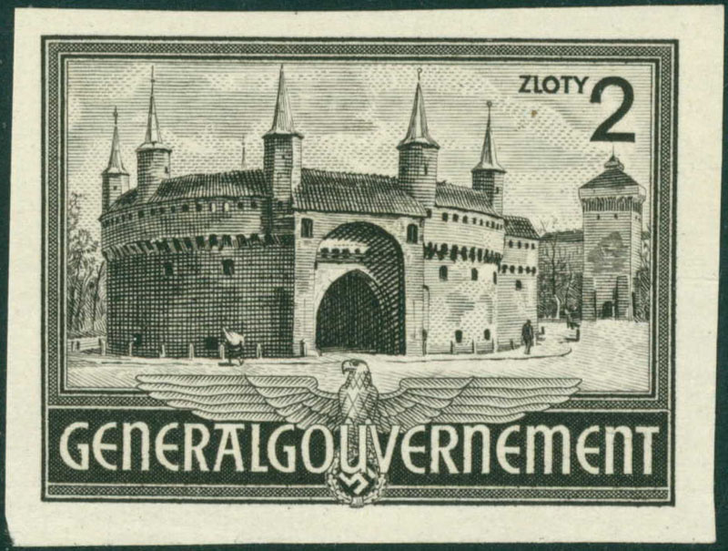 1941 "UBERNAHME DES DISTRIKTS GALIZIEN I DAS GENERALGOUVERNEMENT" powstanie Dystryktu Galicji, dwa znaczki na karcie (na odwrocie adres) ostemplowane okolicznościowo 1.VIII we Lwowie; zwraca uwagę znaczek za 60 gr z silnie przesuniętą perforacją pionową. | Fi.10; 48, 49 |