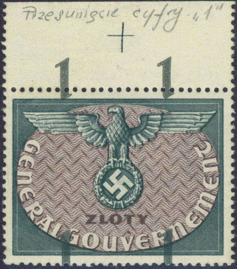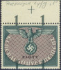 1940 godło Rzeszy w dużym formacie, znaczek ze spektakularnie przesuniętym drukiem nominału, druk na papierze lekko sfałdowanym pod prawą "1", na górnej krawędzi marginesu arkusza ślad po podlepce. | Fi.U13 MK |