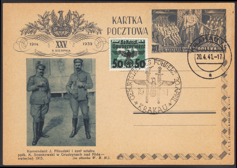 1941 25. rocznica wymarszu I Kompanii Kadrowej Legionów, całostka z ilustracją nr 7 - Komendant J.Piłsudski i szef sztabu ppłk. K.Sosnkowski w Grudzynach nad Nidą - kwiecień 1915 z doklejonym znaczkiem wydania przedrukowego, znak opłaty całostki skasowany datownikiem KRAKAU 1, znaczek stemplem okolicznościowym; niecodzienny walor w dobrym stanie zachowania. | Fi.35; 9a, Cp88 |