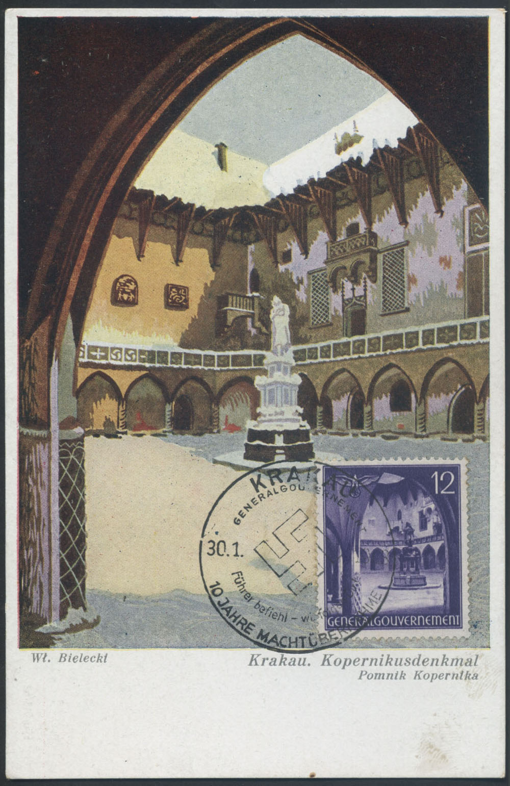 1943 karta maksimum z pomnikiem Mikołaja Kopernika na dziedzińcu Uniwersytetu jagiellońskiego z stemplem okolicznościowym z Krakowa 10. rocznicy przejęcia władzy przez Hitlera. | Fi.67, 29 |