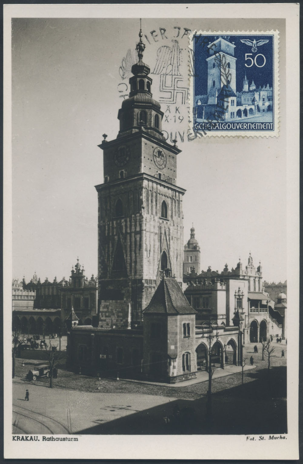 1943 karta maksimum z krakowską wieżą ratuszową i stemplem okolicznościowym z Krakowa 4. rocznicy utworzenia GG. | Fi.48, 34 |