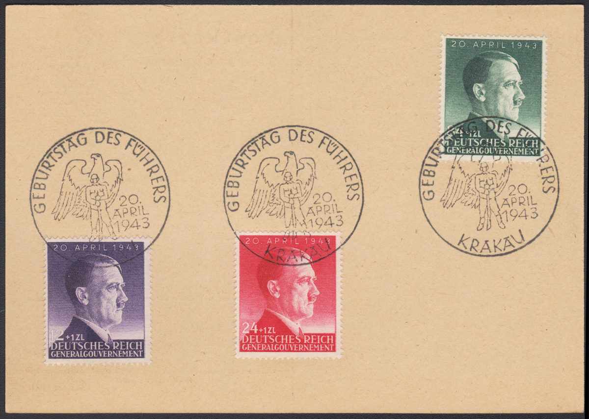 1943 urodziny Hitlera, seria znaczków na karcie ostemplowana 20.IV w Krakowie; bardzo dobry stan zachowania. | Fi.101-03; 30 |