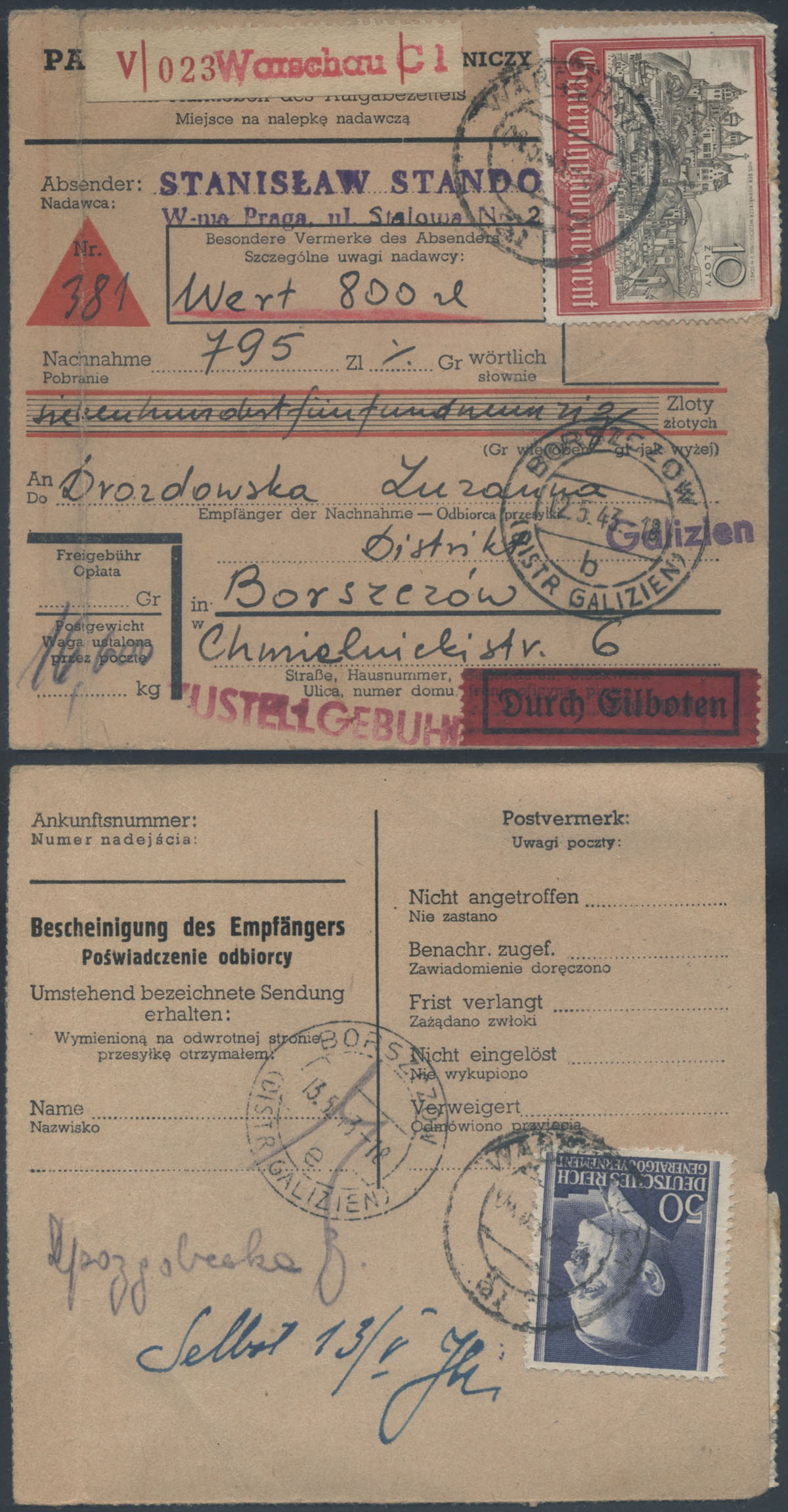 1943 ekspresowy przekaz paczkowy z Warszawy do Borszczowa, opłata rzadkim na korespondencji znaczkiem wydania zabytkowych budowli za 10 zł. | Fi.116, 83 |