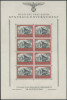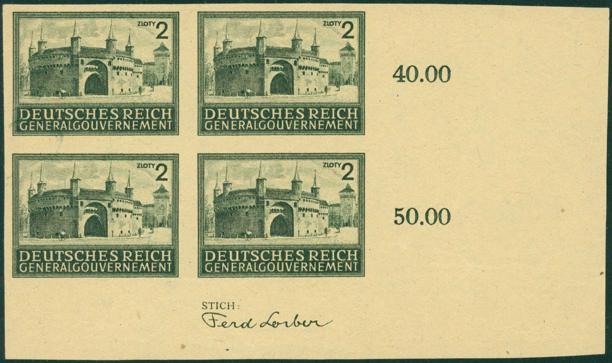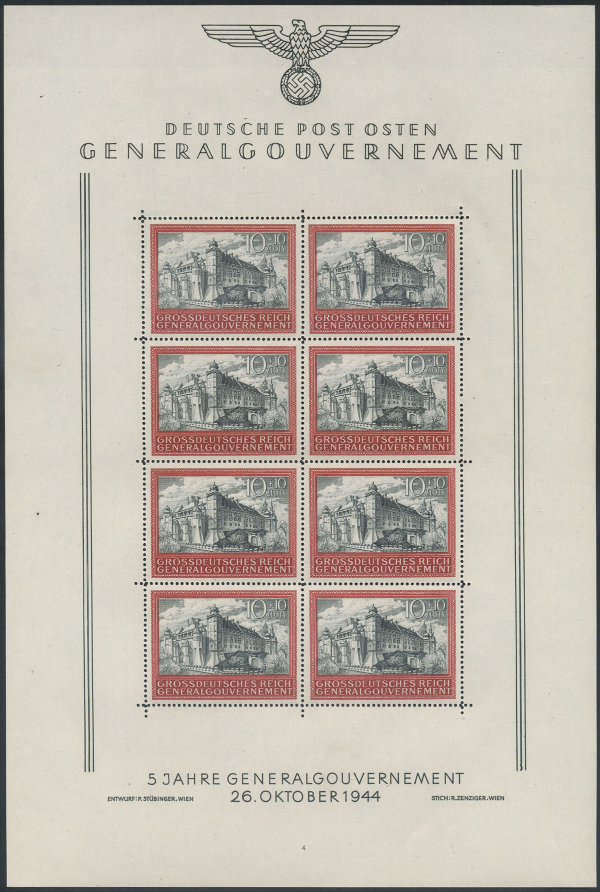 1943 godło Rzeszy na tle Wawelu, arkusz znaczka dopłaty za 16 gr. złożony w połowie, kilka niewielkich rozdarć perforacji. | Fi.U29 ark. |