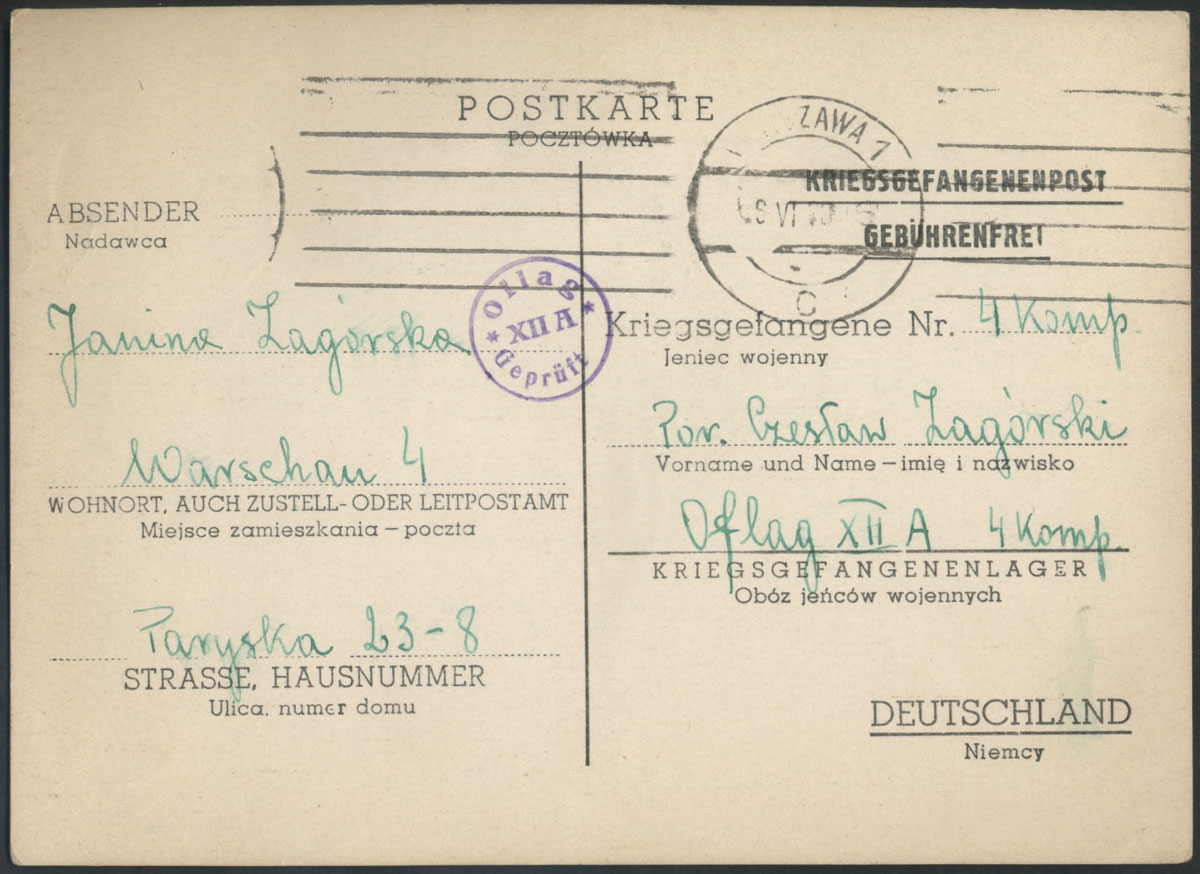 1941 Oflag XIIA Hadamar, kartka na formularzu do korespondencji z jeńcami wojennymi wysłana z Warszawy 6.06.40 do oflagu, stempel cenzury obozowej. | |