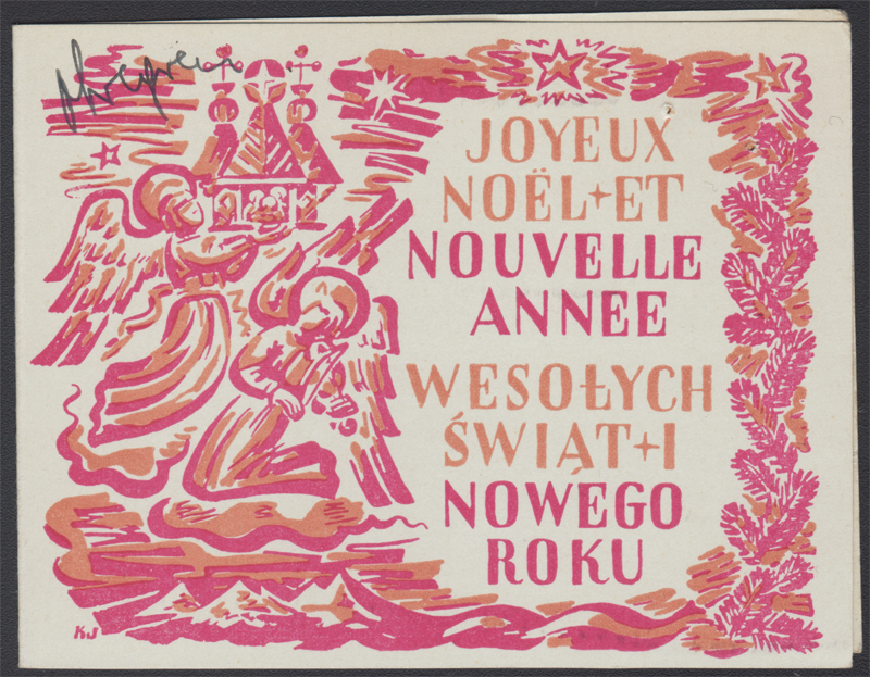 1943 Internowanie w Szwajcarii, czysty karnecik z życzeniami z okazji świąt Bożego Narodzenia i noworocznymi w formacie poziomym z tekstem trójjęzycznym z ilustracją przedstawiającą anioły z szopką i skrzypcami w barwach brązowej i czerwonej, życzenia dla oficerów sztabu dywizji wypisane na maszynie w obozie Matzingen podpisał ppłk Władysław Czoch; karneciki przesyłano w kopertach bez opłaty pocztowej, tak samo jak pocztę internowanych, jako cenzurowane przesyłki poczty polowej; rzadki walor w bardzo dobrym stanie zachowania. | |