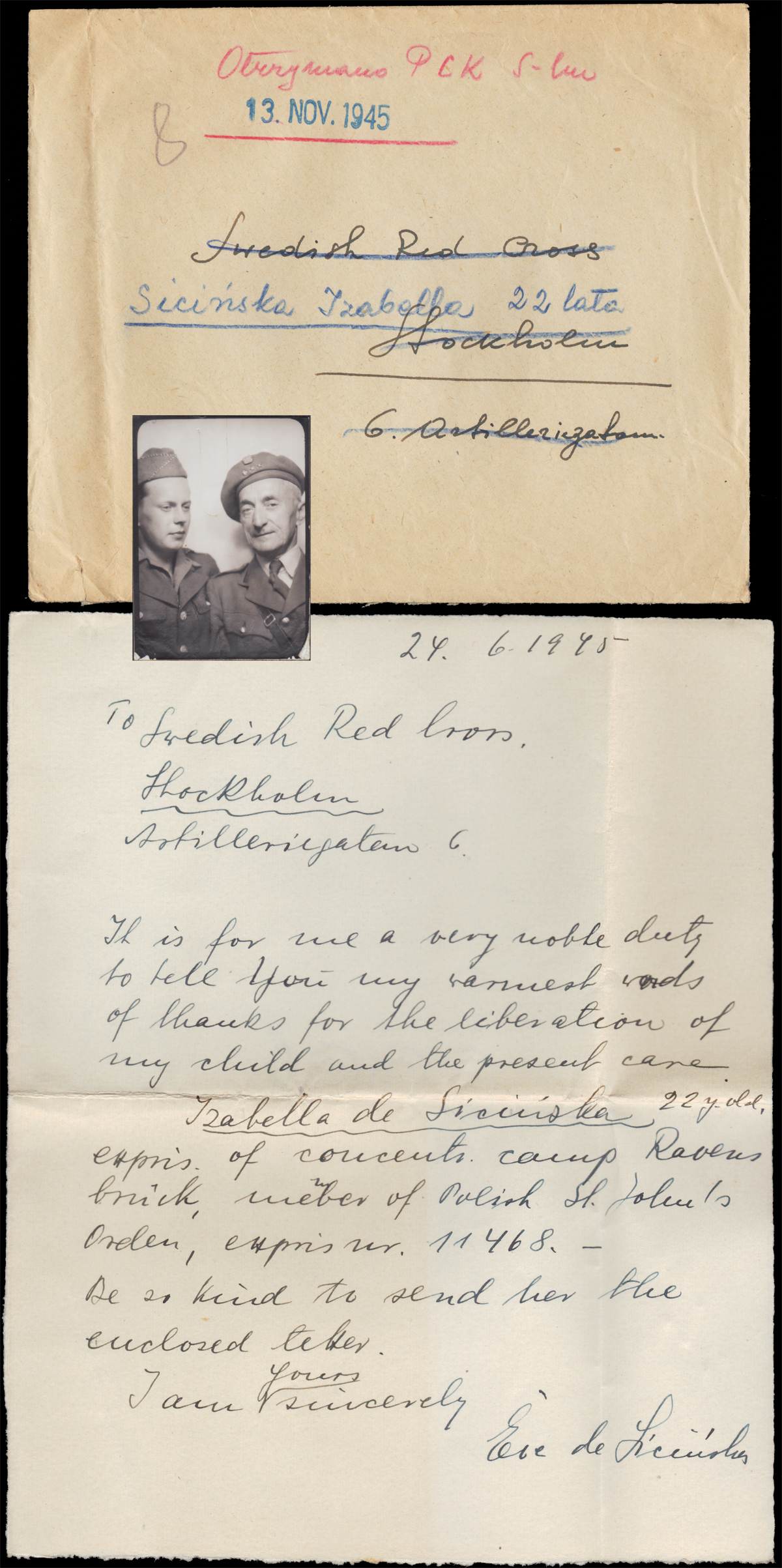 1945 koperta z trzema listami i fotografią od rodziny przebywającej na terenie Belgii do Czerwonego Krzyża w Szwecji, a za jego pośrednictwem do krewnej - byłej więźniarki niemieckiego obozu koncentracyjnego Ravensbrück, znajdującej się wśród prawie pięciu tysięcy kobiet, które pod koniec kwietnia 1945, dzięki akcji humanitarnej "Białe Autobusy", zainicjowanej przez bratanka króla Szwecji i wiceprezesa Szwedzkiego Czerwonego Krzyża – hrabiego Folke Bernadotte, udało się wyrwać z obozu Ravensbrück i przewieść do Szwecji; pieczątka z datą wpływu "13.NOV.1945" z adnotacją czerwoną kredką "Otrzymano PCK S-lm"; historyczny dokument w bardzo dobrym stanie zachowania. | |