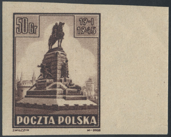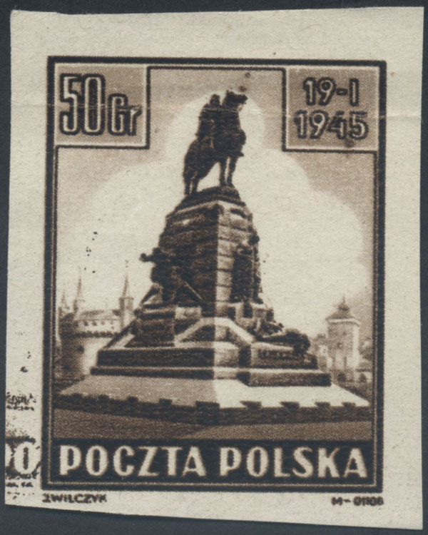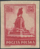 1945 zabytki Krakowa - Pomnik Grunwaldzki, próba znaczka za 50 gr. w kolorze karminowym, na papierze drzewnym szarożółtym grubym gąbczastym, wersje z pełną oryginalną gumą i niegumowana, gwarancja i oznaczenie. | Fi.362z1 P3 Mi.393 U |
