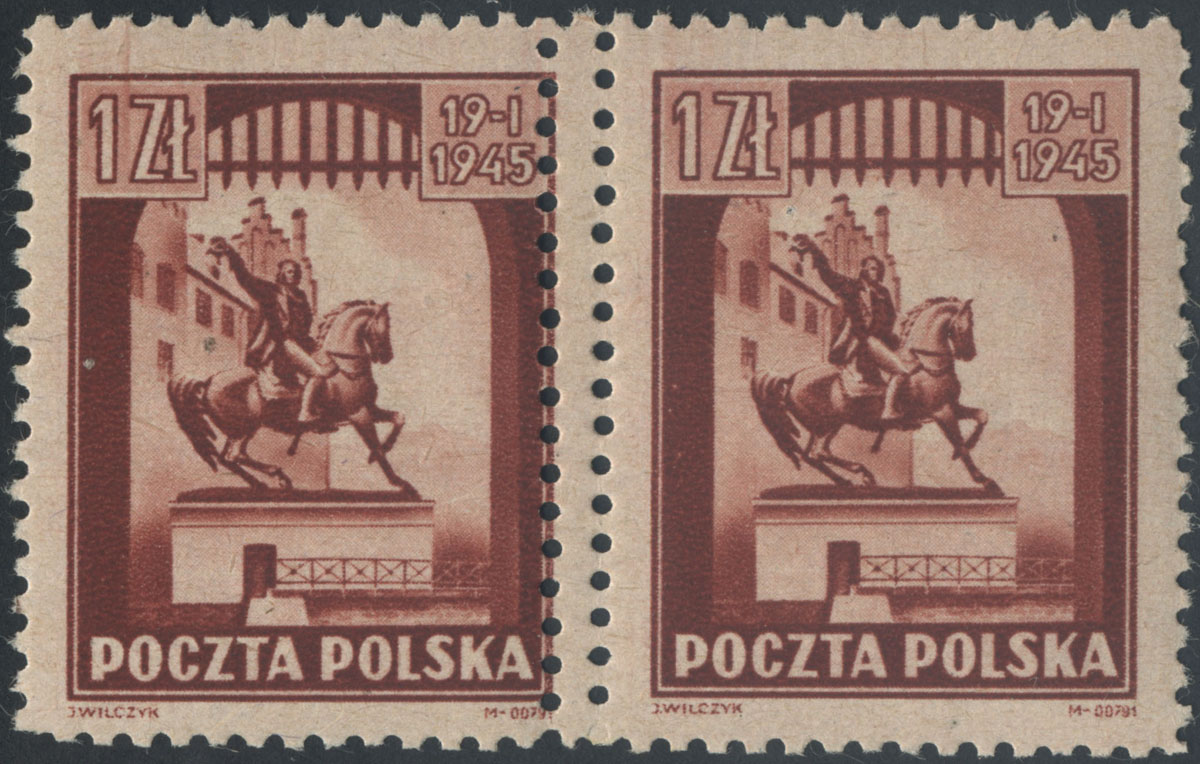 1945 zabytki Krakowa - pomnik T.Kościuszki, parka makulatury znaczków za 1 zł. na niebieskoszarym szorstkim drzewnym papierze, bez perforacji pionowej między znaczkami, gwarancja i oznaczenie Schmutz. | Fi.363y MK Mi.394 Us |