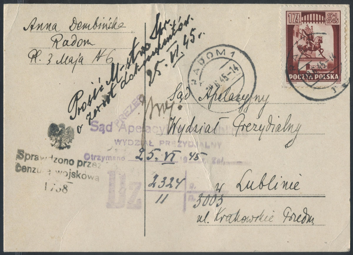 1945 kartka z Radomia do Lublina, stempel cenzury wojskowej nr 1758. | Fi.363 |