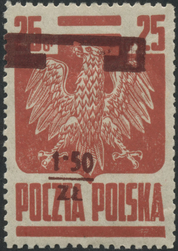 1945 wydanie przedrukowe, znaczek za 1,50zł./25gr. w kolorze brązowoczerwonym z mocno uszkodzonym prawostronnie nadrukiem I formy poz.50 - określanym jako błąd "dziura w belce"; co ciekawe perforacja pionowa jest przesunięta - znaczek dużo szerszy od typowego, a sam nadruk obrócony i skośnie przesunięty, przez co widać uszkodzenia belki z poz.60 i fragment mocno podniesionej belki z poz.59, bardzo ciekawe, gwarancja i opis Walisch. | Fi.376a B Mi.409b |