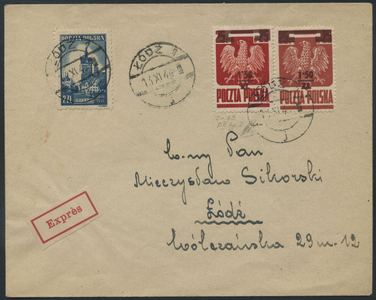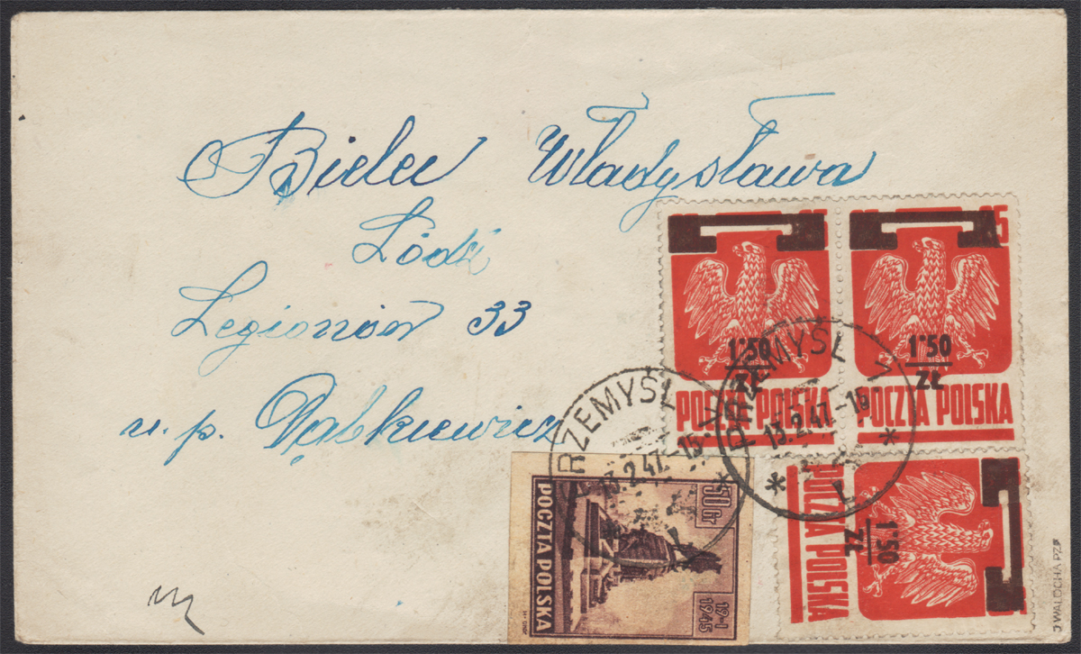 1945 wydanie przedrukowe, znaczki za 1,50 zł w kolorze brązowoczerwonym (III forma, typ 2) - frankatura mieszana, list wysłany 13.2.47 z Przemyśla do Łodzi ofrankowany znaczkiem pojedynczym i parką poziomą - prawy znaczek z zaawansowanym błędem "belka zasłaniająca dawną wartość uszkodzona z prawej strony", ponadto nieząbkowany znaczek za 50 gr z serii zabytki Krakowa; opłata zgodna z taryfą; bardzo dobry stan zachowania; gwarancja Walocha. | Fi.376a T2, 362I Mi.409b, 393 |