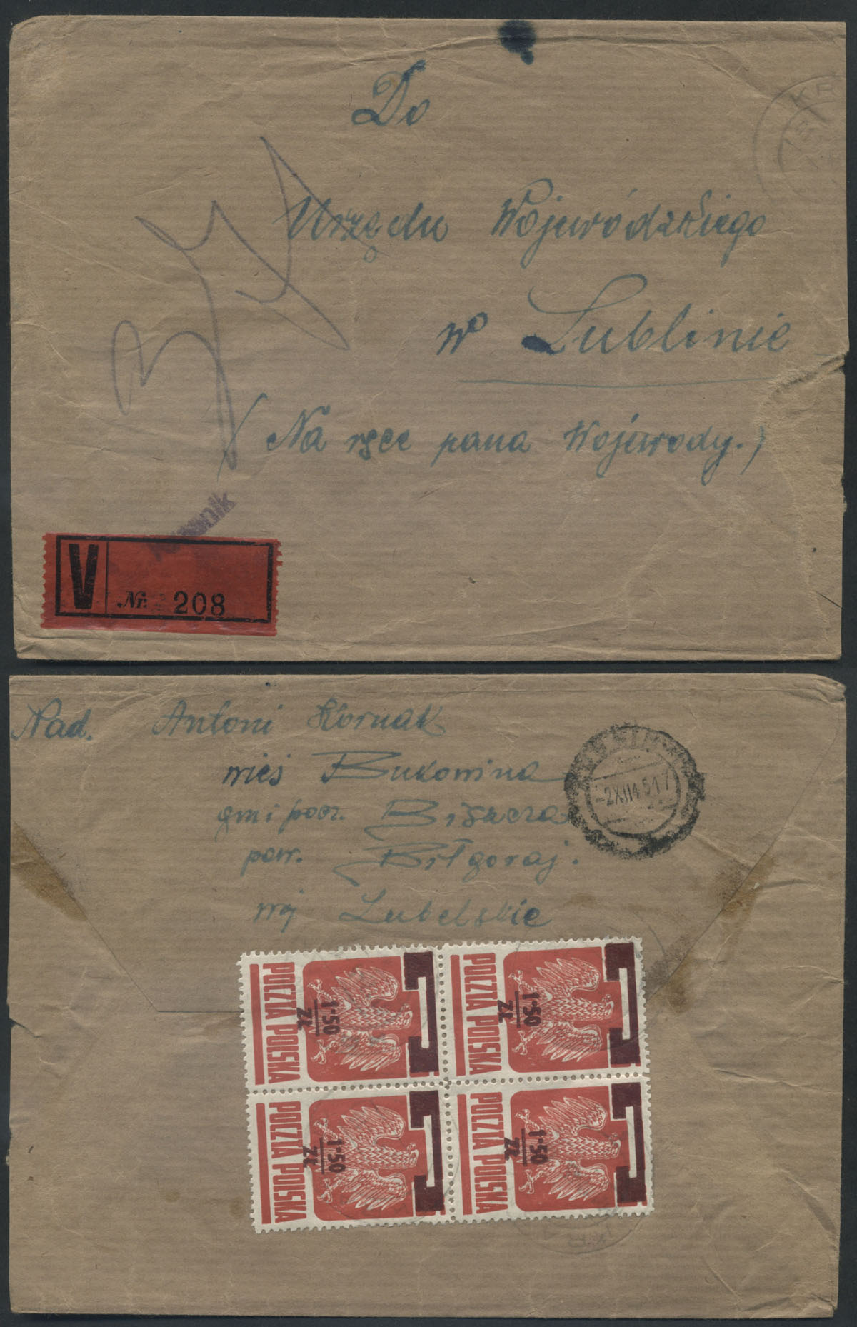 1945 list polecony z Kraśnika nadany 1.12.45 do Lublina, ciekawe użycie niemieckiej nalepki do listów wartościowych jako erki z kasownikiem prowizorycznym Kraśnika, na odwrocie stempel odbiorczy. | Fi.376a |