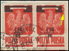 1945 wydanie przedrukowe, parka znaczków za 1,50zł./25gr. w kolorze brązowoczerwonym z lekko obróconym nadrukiem I formy na znaczku podstawowym z częściowym abklatschem na odwrocie (Fi.60.-), brak ząbka po prawej stronie. | Fi.376a MK4 Mi.409b |