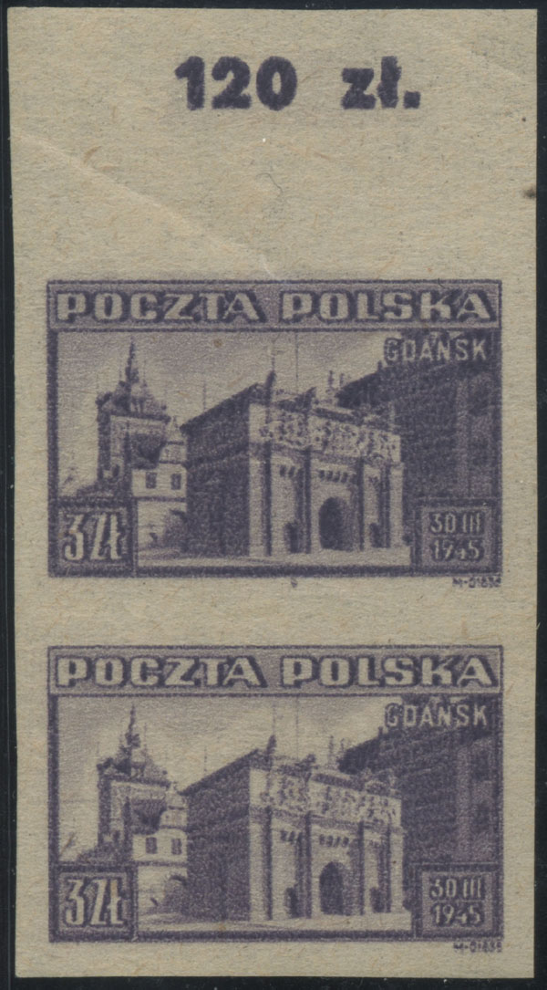 1945 zabytki Gdańska, zestaw 2 znaczków - w barwie bladofioletowej z nieostrym rysunkiem znaczka i w barwie ciemnofioletowej, gwarancja i opis Walocha. | Fi.379Aa, b Mi.412B |