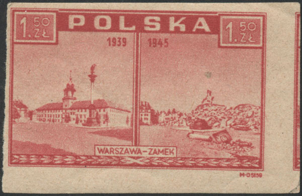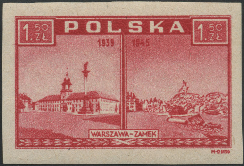 1945 Warszawa oskarża, znaczek w barwie karminowoczerwonej na papierze y3a, gwarancja i oznaczenie Walocha. | Fi.380b Mi.414 |
