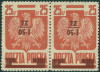 1945 wydanie przedrukowe, kiedyś parka znaczków za 1.50zł./25gr. w kolorze czerwonym (Mi.2 x 500 euro), nadruk II formą poz.95 i 96, dwa różne typy - z kropką na górze i na 2/3 wysokości cyfr; zdjęte z listu użytkowego nadanego w Krakowie 25.X.45; na liście były jeszcze parką i to parką w najrzadszym układzie kropek typ 2+typ 1 (wycena takiej parki Fi.7000.-), podczas odmaczania parka zapewne się rozpadła, ale oba znaczki zachowały się w bardzo dobrym stanie gwarancja Ryblewski, z opisem Schmutz. | Fi.376b FII T2 i T1 Mi.409a |