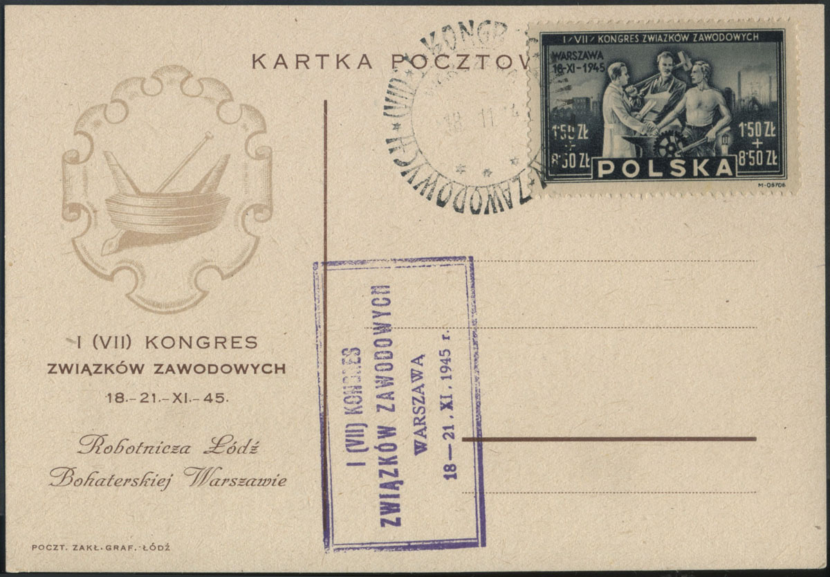 1945 VII Kongres Związków Zawodowych - znaczek skasowany 20 11 na okolicznościowej karcie. | Fi.386 Mi.413 |