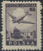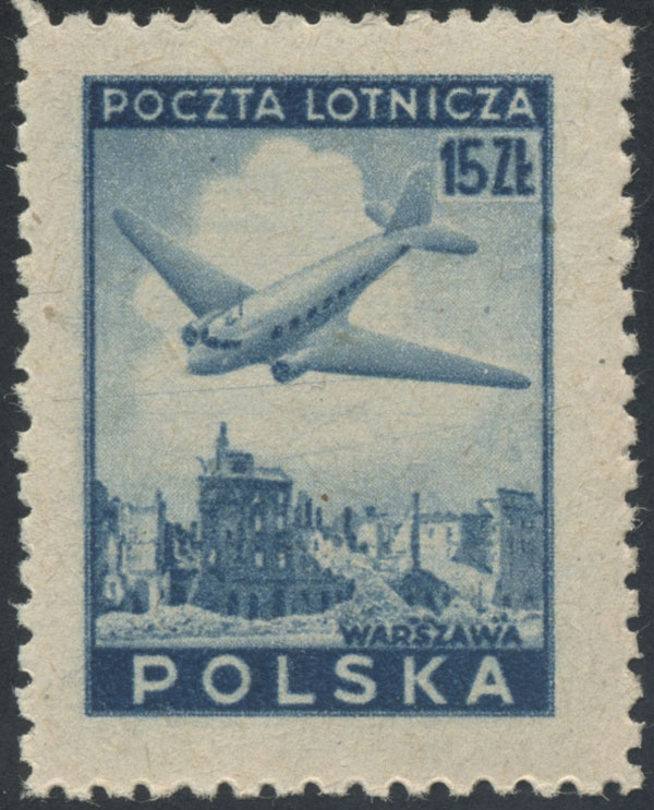 1946 samolot nad Warszawą, parka znaczków ciętych po 10 zł. skasowana okolicznościowo na wystawie regionalnej z okazji 400-lecia miasta Leszna, gdzie znaczki cięte były w sprzedaży (Fi.800.-), gwarancja Krawczyk. | Fi.396 nz Mi.429 |