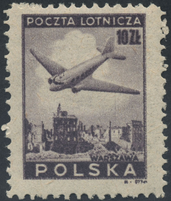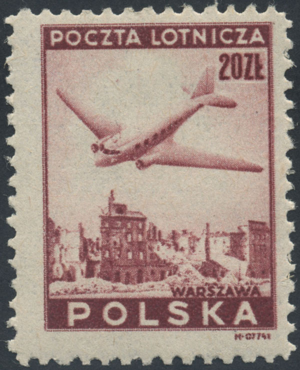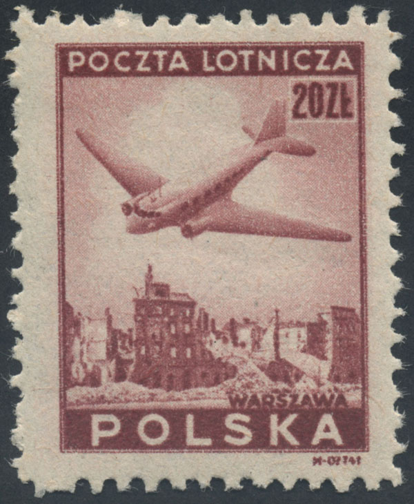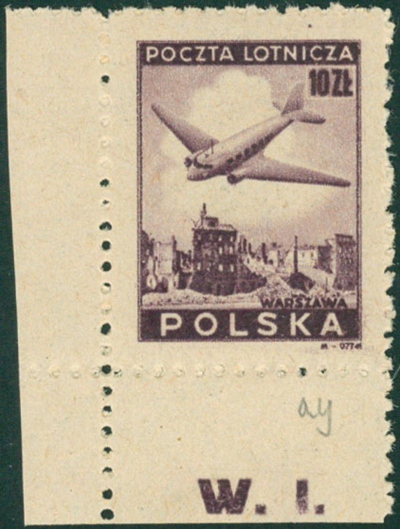 1946 wydanie lotnicze, narożny znaczek z numerem walca W.I., na górnym marginesie znaczka, powtarzalna dla tej pozycji, usterka w postaci fioletowej kropki nad literami "IC". | Fi.396 Mi.429 |
