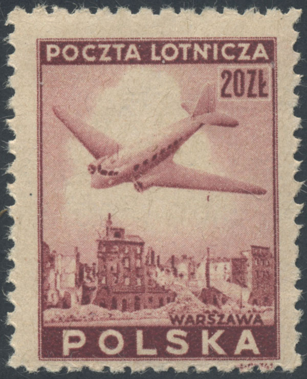 1946 wydanie lotnicze - samolot nad Warszawą, makulaturowy znaczek za 20 zł. ze znacznym przesunięciem perforacji poziomej i lekkiej pionowej, piękny stan, gwarancja i oznaczenie Walocha. | Fi.398 MK Mi.431 |