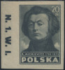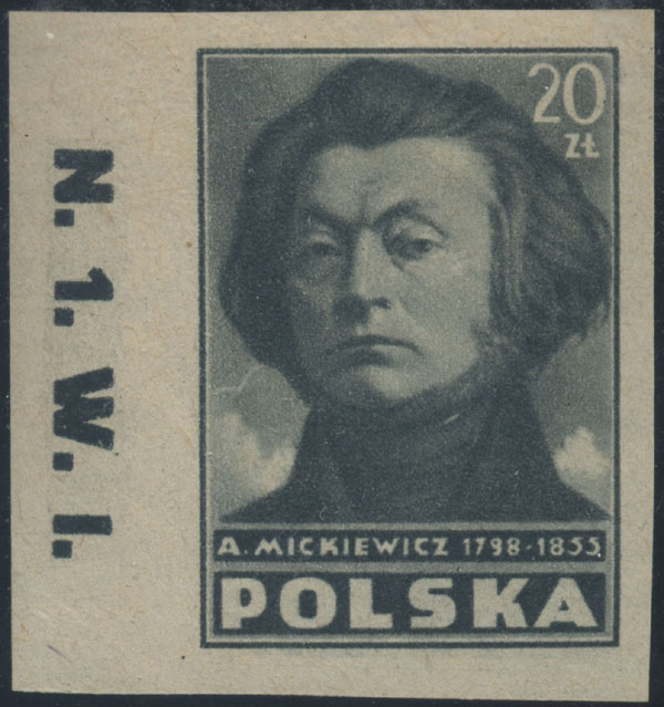 1947 kultura Polska (II) - Fryderyk Chopin, nieząbkowany znaczek za 3 zł., tylko w kilku przypadkach z danego walca drukowano jeden rodzaj znaczków ząbkowane bądź nieząbkowane, tak właśnie było w przypadku walca N.3.W.II. - drukowano z niego jedynie znaczki ząbkowane (patrz PZP str.368) i cięte nie powinny istnieć, w katalogu Fischera pojawiły się pierwsze próby tego wydania, na razie w sposób niepełny skatalogowane - z pierwszego wydania skatalogowano trzy próby, z drugiego dziesięć w tym dwie znaczka za 3 zł - z walca N.2.W.II i N.3.W.I, jedną znaczka za 10 zł - z walca II i siedem - znaczka za 20 zł. z walców I, II, III, IV, V, VI i VII, te ostatnie próby dokładnie opisał L.Schmutz w styczniowym numerze Filatelisty na str.38-42; w ślad za tym zarówno pozostałe próby jak i znaczki cięte zostaną pewnie wkrótce opisane i skatalogowane. | Fi.431 nz Mi.465U |
