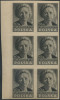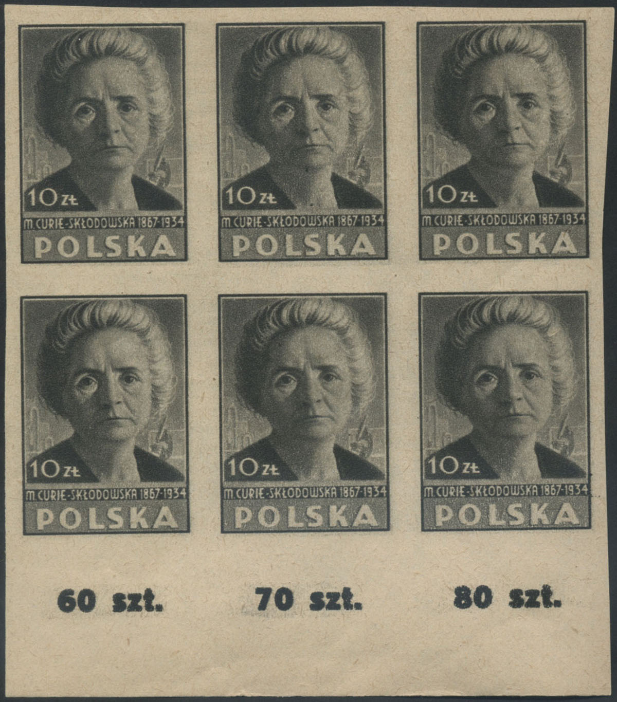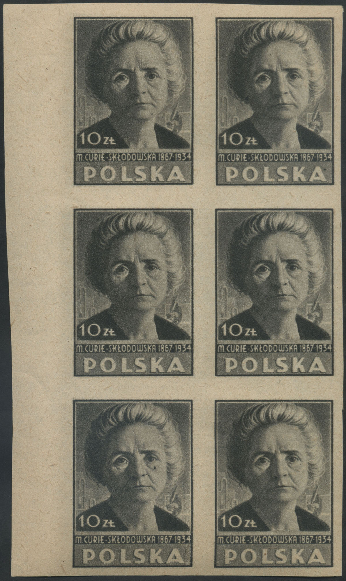 1947 Kultura polska (II) - 6 zł, nieząbkowane (Świętochowski, Żeromski, Prus), czworoblok, lewy górny znaczek z błędem "smuga na prawym narożniku arkusza"; dobry stan zachowania (na trzech znaczkach ślady podlepek); gwarancja Walocha. | Fi.433A Mi.467B |